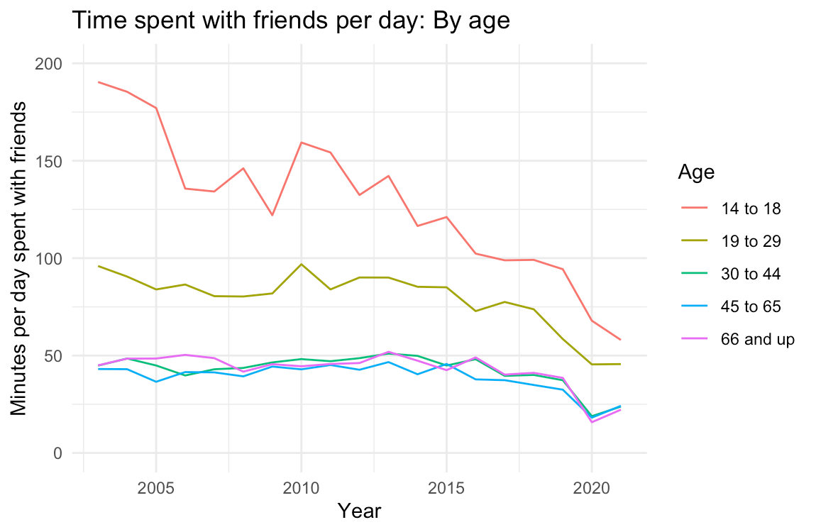 A sizable majority of Americans (61%) say they have between zero and four close friends. When you look only at younger people, the isolation grows. 68% of people aged thirty and younger say they have four close friends or fewer. If you zoom out and look at trends over time, the story starts to grow even more stark. People have begun to spend less and less time with friends, and more and more time alone.