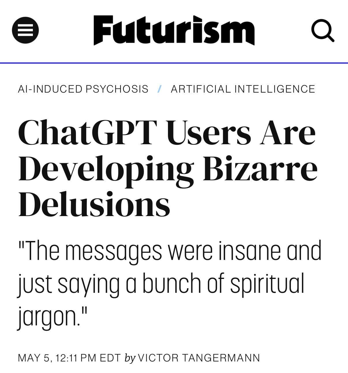 A psychiatrist got online and posted something remarkable the other day: so far this year he’s seen 12 people hospitalized after losing touch with reality because of AI. I had trouble believing it, as one should when encountering a random story online. Then I opened Kelly Hayes’ excellent newsletter and read about the case of Alex Taylor, who was killed by police after an AI-related breakdown. Kelly cites a Rolling Stone piece that reads “AI enthusiasts are alarmingly susceptible to spiritual and paranoid fantasies divined from their conversations with chatbots, whether or not they already experience some form of mental illness.”