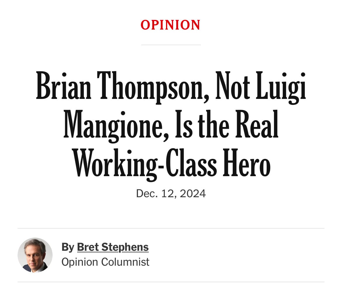 But after this initial failure to engage, the scions of these establishments have pivoted to something more sinister. The Washington Post shared one of their pieces a few days ago, pulling out the following quote for their audiences of social media: “Luigi Mangione, a son of a prominent Baltimore family and an Ivy League graduate, had seemingly lost his way. Brian Thompson, a son of small-town Iowa who ascended to become CEO of UnitedHealthcare, appeared to be reaching new heights.” The executive is really the little guy. Never mind the $10 million he took home last year. Never mind his role in society, and how he fundamentally profited off being a traitor to his class.