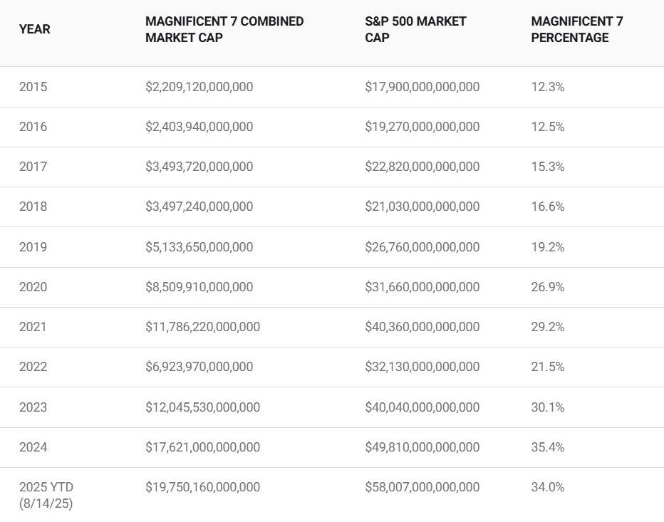 Data centers also have their supporters, of course. Beyond just Silicon Valley, numerous investors are eager to see the value of the biggest tech companies go up and up and up. More than a desire to see a good product, more than the desire to see Musk and Zuckerberg and Bezos create something useful, these folks want to see stock prices rise eternally. Right now just seven tech companies, known as the Magnificent 7, make up over a third of the value on the S&P 500. Apple, Tesla, Microsoft, Amazon, Meta, Nvidia, and Alphabet (Google) have a combined market cap of nearly $20 trillion. Ten years ago that number was $2 trillion: