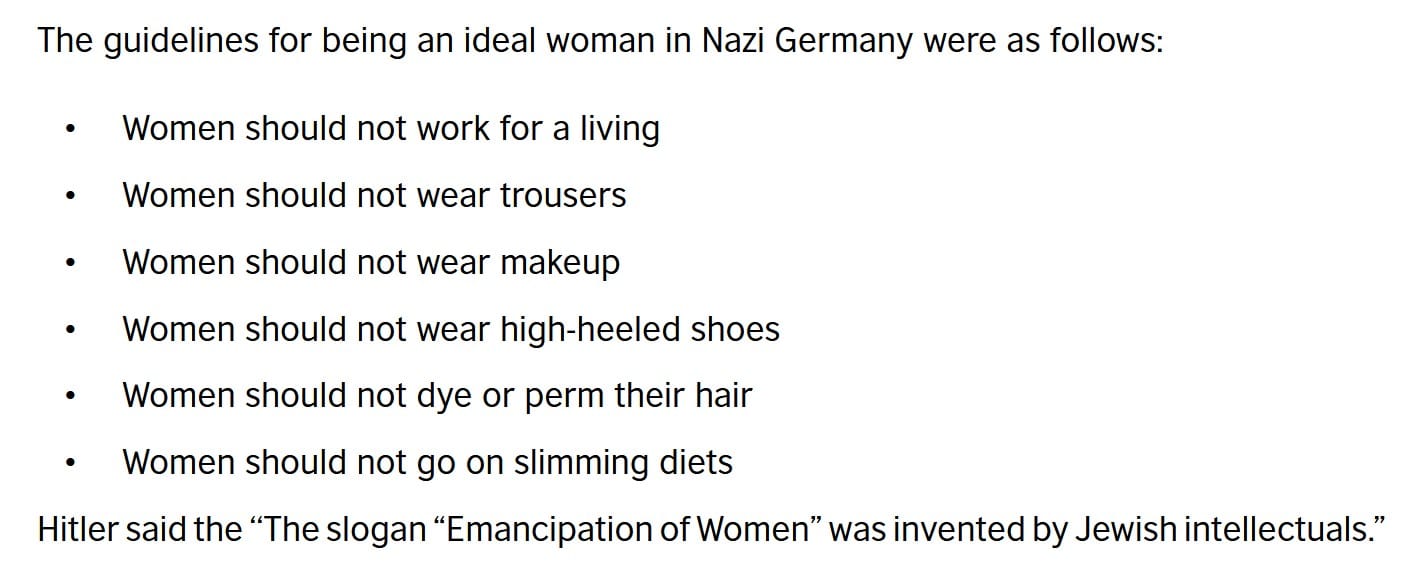 Nazi Germany provides one of the clearer examples of all this. Ruchira Gupta, writing about how feminism and women fared under Hitler, lays it out: