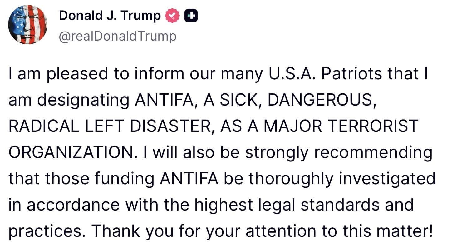 The clearest declaration of intent came directly from Donald Trump in the midst of the media firestorm around Jimmy Kimmel. Right as everything was unfolding he decided to declare “antifa” as a terror group;