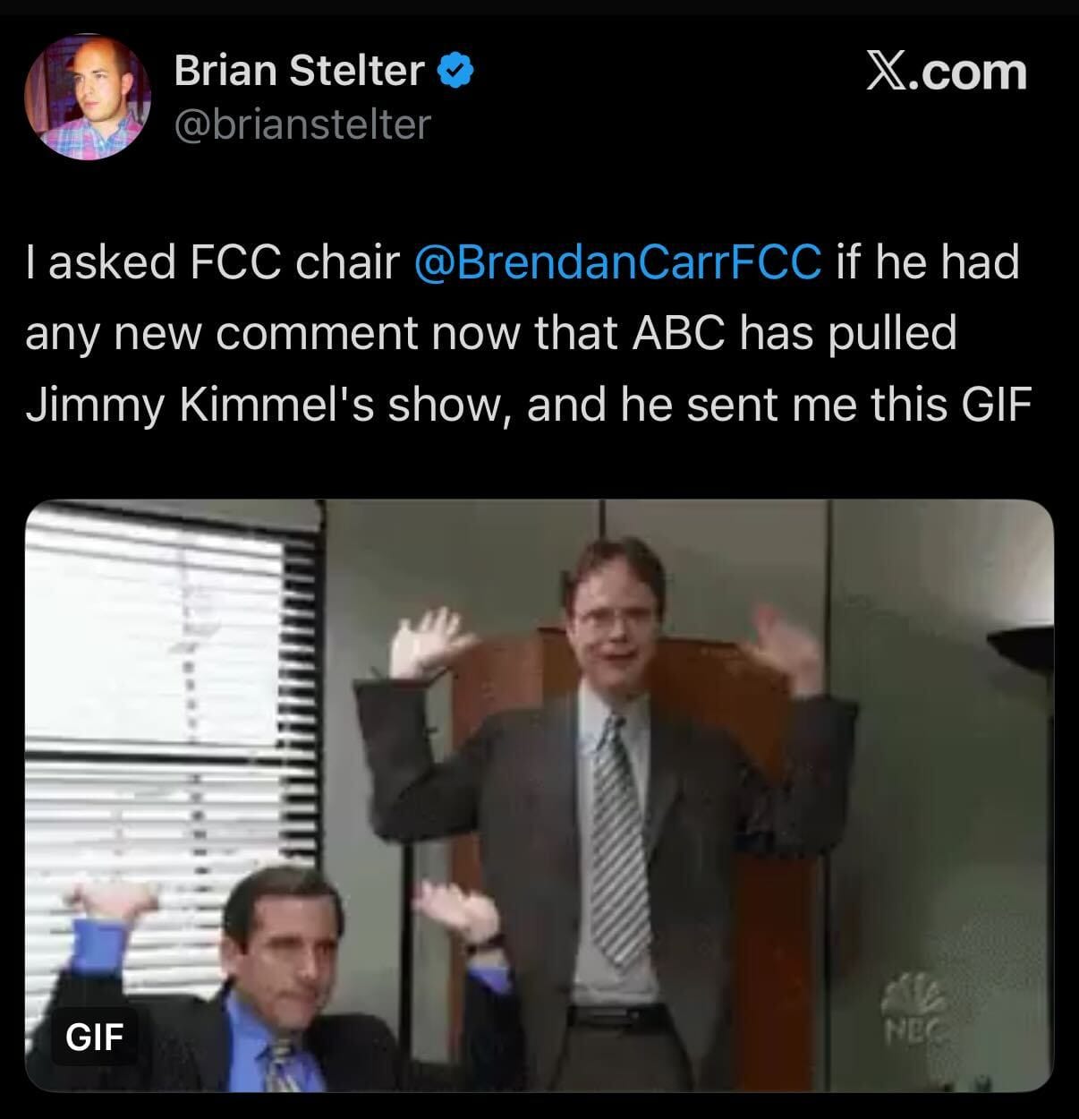 If you can’t see, that’s a GIF from the TV show The Office. The most childlike possible response celebrating the assault on freedom of the press, sent by the head of the federal regulatory agency overseeing the media. This is where we are.