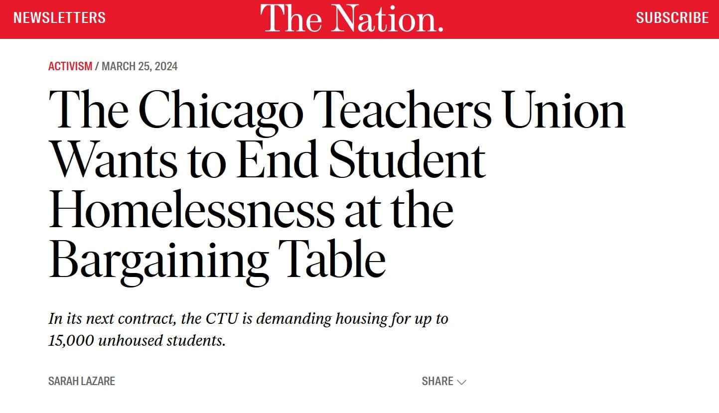 Ultimately, tenant organizing aims us toward a society where housing isn’t a for-profit industry, much like trade unions aim us toward a world where we control our workplaces democratically. Both are vital tools in creating a world that is just, equitable, and actually democratic. The Chicago Teachers Union is currently showing us a beautiful example of how building worker power can lead us toward this better world, and it’s at the intersection of labor and housing. This incredible union is going far beyond trying to win better wages and job conditions; the educators of Chicago are aiming to get housing for homeless students.