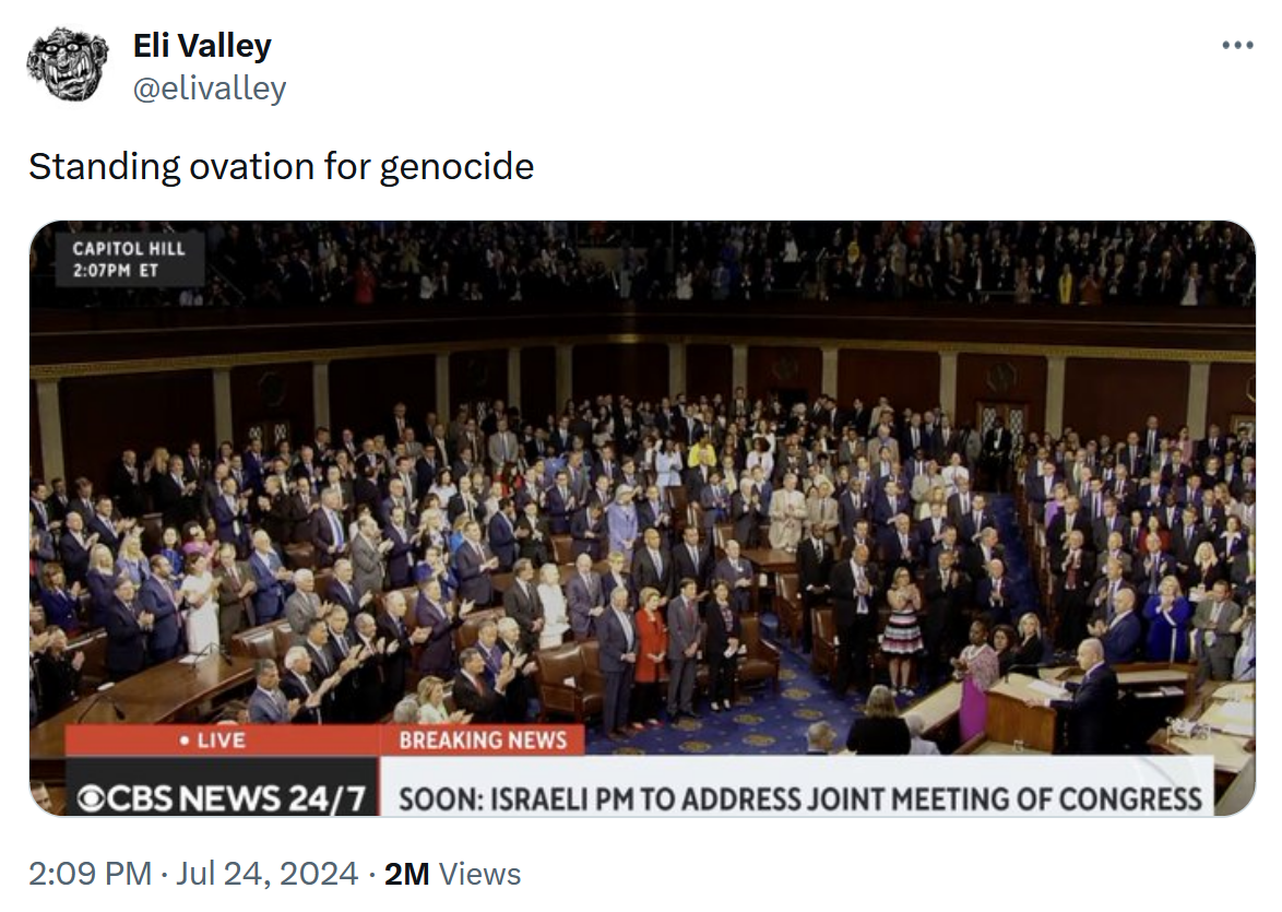 Benjamin Netanyahu’s address to Congress yesterday was the most atrocious and revolting speech I’ve ever had the misfortune of feeling compelled to watch. Statistically, it was probably composed of more falsehoods than truths, and is better described as a propaganda and lie-filled rant than a speech. Even worse, as difficult a bar as that is to clear, was the reaction. The vast majority of Congress stood and cheered at the end of nearly every sentence. They applauded lie after lie, they applauded his smearing of U.S. anti-genocide protesters, they got up and sat down like puppets on the end of a string, with hands that must have burned from clapping so vigorously and frequently for over half an hour.