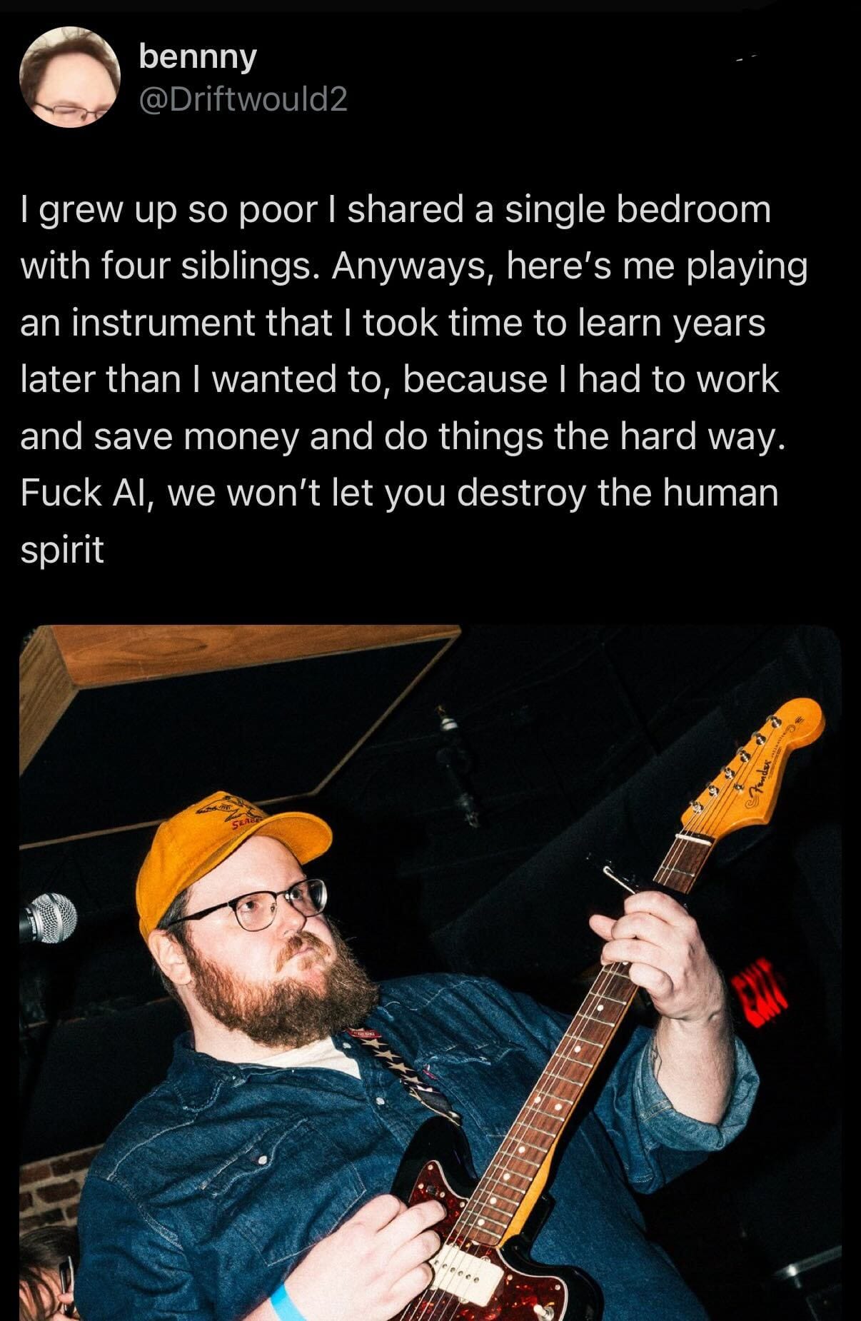 One person after another talked about a true love of music, a passion for the art form, a joy that led them to seek out playing and making music despite obstacles and inconveniences. The sentiment that jumped out to me the most, that struck me, was that making art and music inherently involves struggle. Entering a prompt into an AI app is not making art not only because it involves no learning, no practice, no skill, but because it involves no struggle, no difficulty, no overcoming.