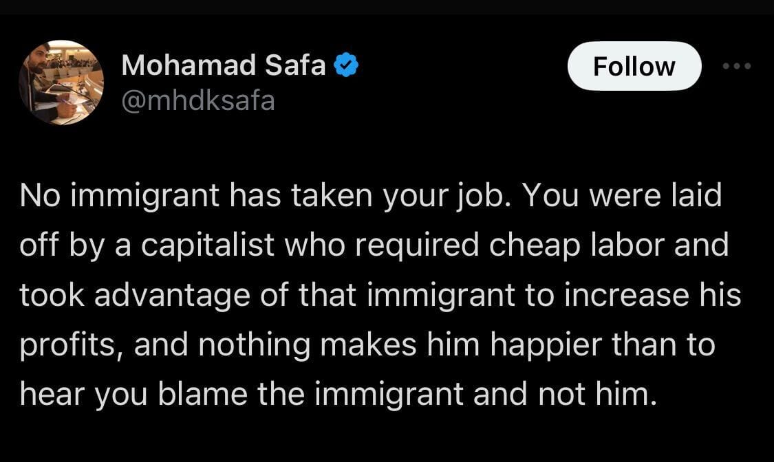 So whether it’s immigration, housing, or any number of issues, those few people desperately want us to not get down to the root, to not look at why this world is set up to extract wealth from everyone around the globe and funnel it into their bank accounts. Africa, Latin America, the Middle East: people would not be leaving these regions to come to the U.S., England, and Europe if the ultra-rich hadn’t destabilized dozens of nations with war and economic extraction. And in the West those same people and their same systems destabilize families and communities, forcing people out of their homes and into the streets.