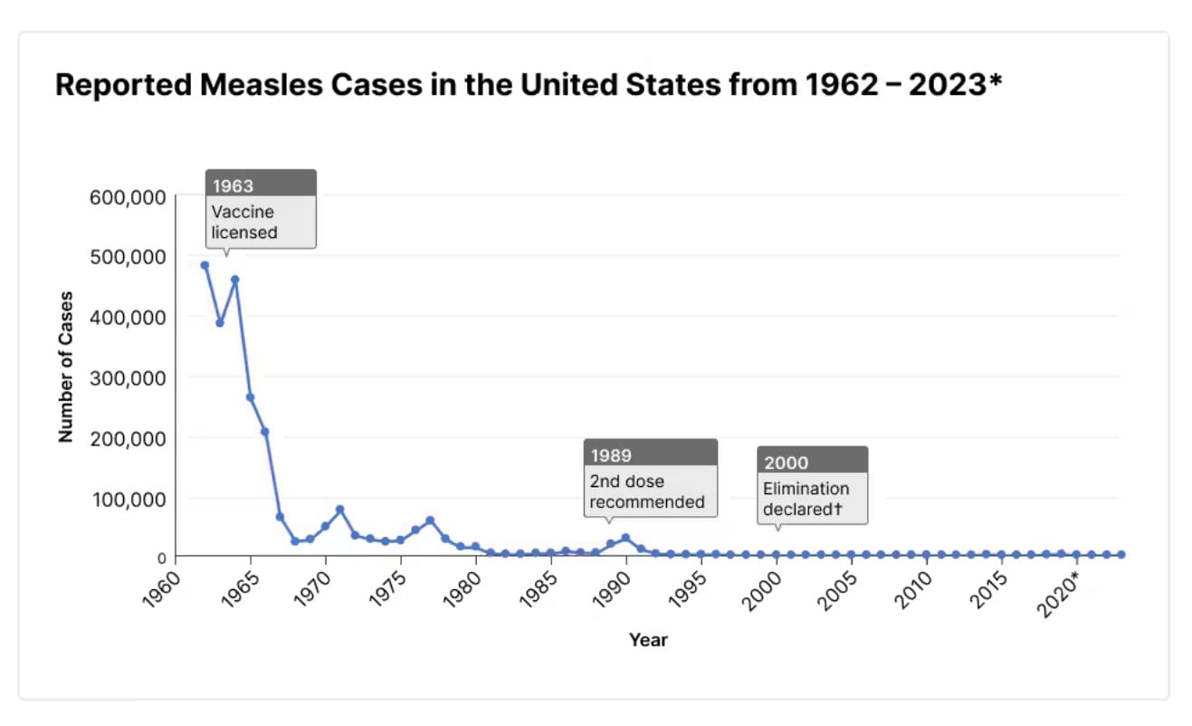 From half a million cases a year to zero. Elimination was declared in 2000, but that was before the anti-vax movement came along. It’s a tragic movement, with a growing number of people believing that the crowning achievement of public health is a secret plot to give their children autism, or microchip them, or whatever the latest story is. People are exposing their kids to measles and risking their lives all because of the rantings of an influencer, or some website like alternativehealings4u, or the growing culture of mistrust and manufactured ignorance.