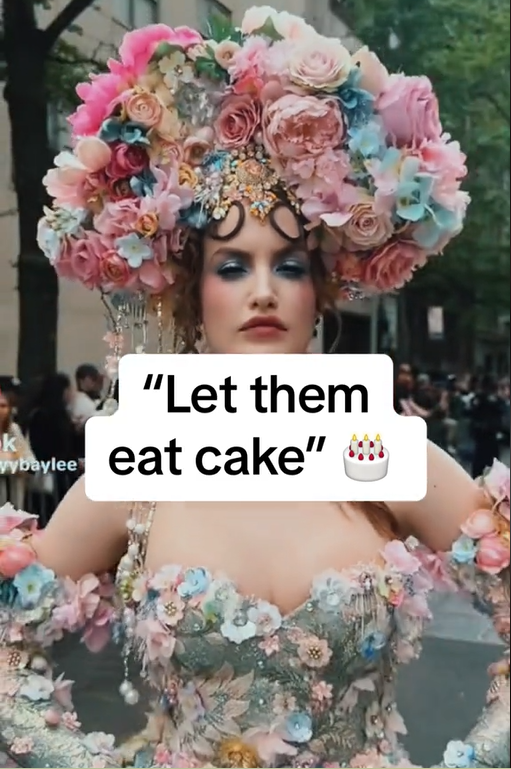 One influencer has, very much accidentally, kicked off something that would’ve been hard to imagine even a week ago. During the Met Gala, Hayley Bayley, who has 10 million followers on TikTok for reasons I neither know nor particularly wish to know, made a little video. In it she was wearing a dress and doing a look very clearly inspired by Marie Antoinette, and the words “let them eat cake” can be heard as the camera slowly zooms out. It was nothing complicated, just a simple and straightforward callback to the infamous phrase as she stood outside an event embodying the lifestyle of the rich and famous. Tickets to the Gala are $75,000, and this year it happened to take place at the exact moment Israel invaded Rafah.