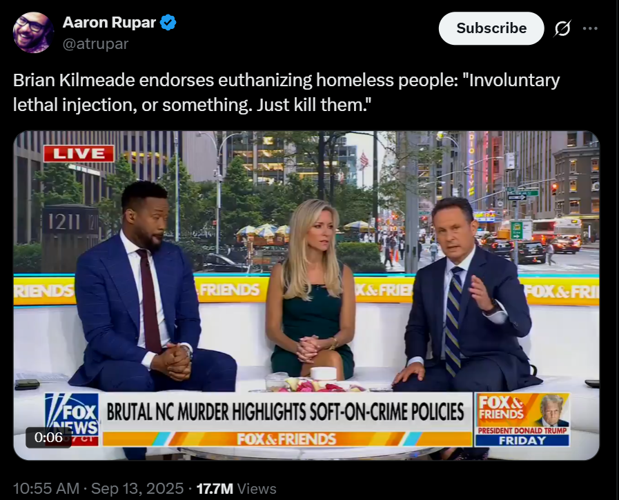 In a moment that was shocking even for Fox News, host Brian Kilmeade advocated for killing mentally ill homeless people, and both of his co-hosts agreed. As his co-host spoke about the homeless, saying they ought to be locked up, Kilmeade interjected: “Or involuntary lethal injection… or something. Just kill ‘em.”