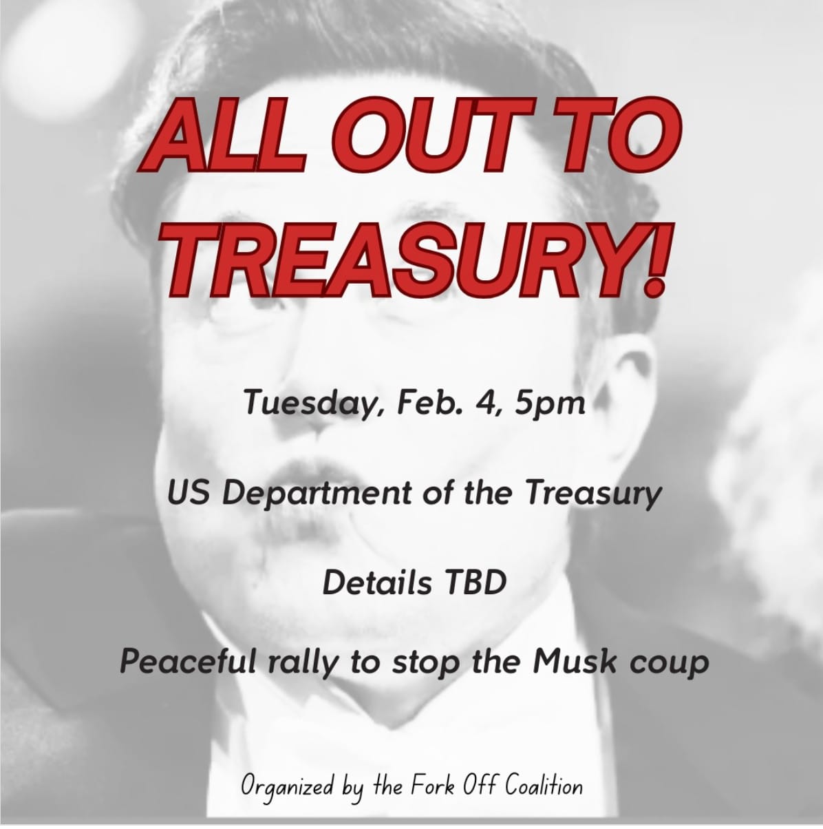 All of this is to say, it’s time for federal workers and their unions to get radical, quick. It might not come from leadership, who certainly didn’t condone the direct action at OPM the other day, but it can come from the workers themselves. It must. And it must come from us, supporting them and taking action with them. 40,000 people showed up in a call to oppose the Musk coup led by the Working Families Party and Indivisible. One of the results of that call was word going out to show up and protest at the Treasury Department at 5 p.m. Tuesday. That’s tonight, if you’re reading this the day it came out. Other protest calls have also been put out to meet there at 7:30 a.m. every day this week.