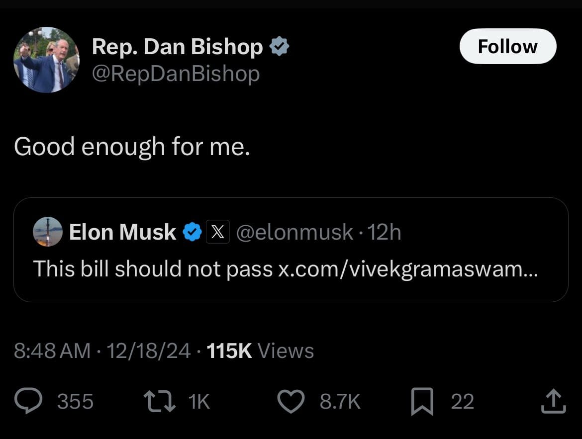Musk used no subtlety, no cleverness to kill government funding. It’s just a matter of the brute force that can be exercised with nearly half a trillion dollars. He threatened members of Congress with endless donations to their future opponents, spread patently false claims, and even amplified tweets saying the government should get no funding until Trump takes office. “We will be fine for 33 days [with no government funding]” read one tweet he blasted out to his over 200 million followers, and to countless other people given the way he’s forced Twitter engineers to rig the algorithm for him.