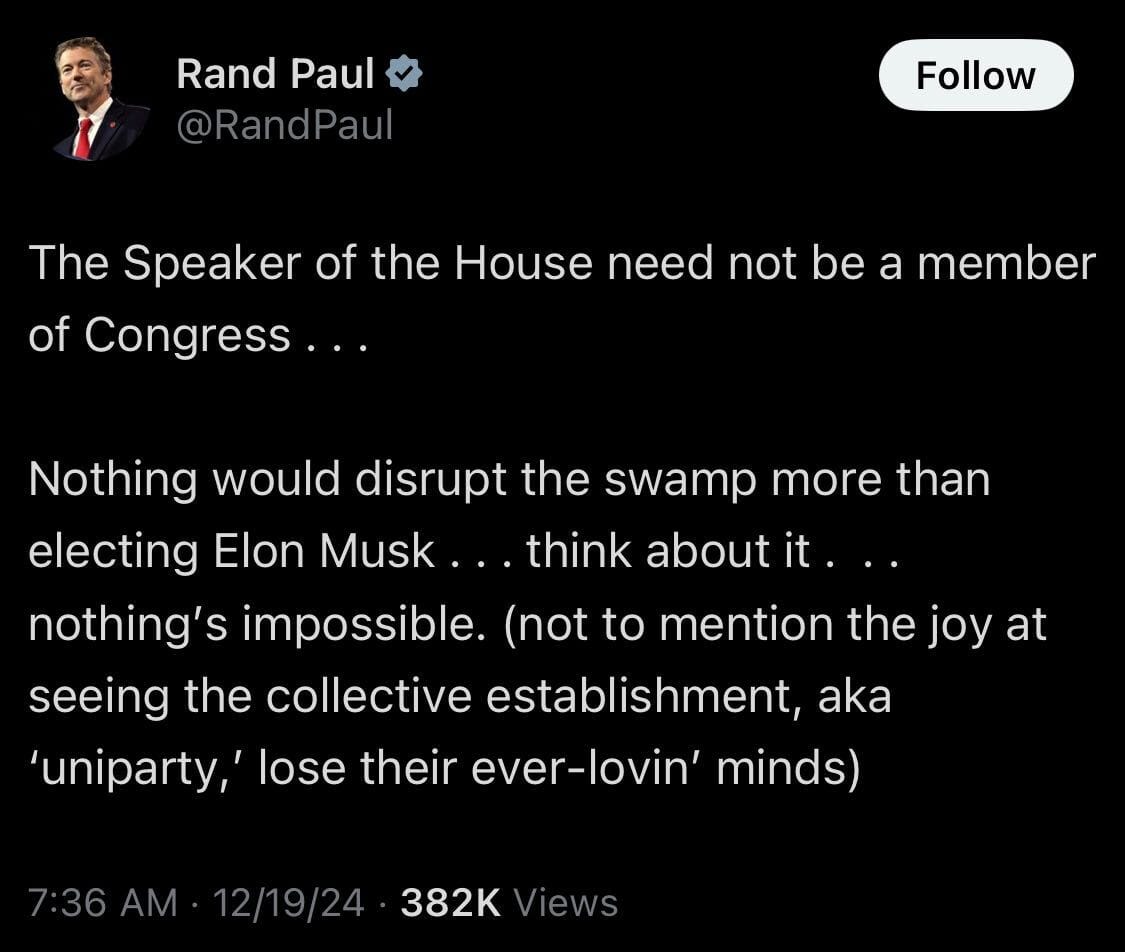 Elon Musk could shut down the government. If some sort of spending plan isn’t passed by tomorrow (Friday, December 20th) the federal government will partially shut down, with countless government workers going unpaid through the holidays, food aid halting, and numerous other services shutting their doors until the money starts flowing again. House Speaker Mike Johnson had a bill that seemed likely to pass 24 hours before the publication of this newsletter, but then the richest man on Earth took to the social media platform he owns and started spreading lies to kill the deal.