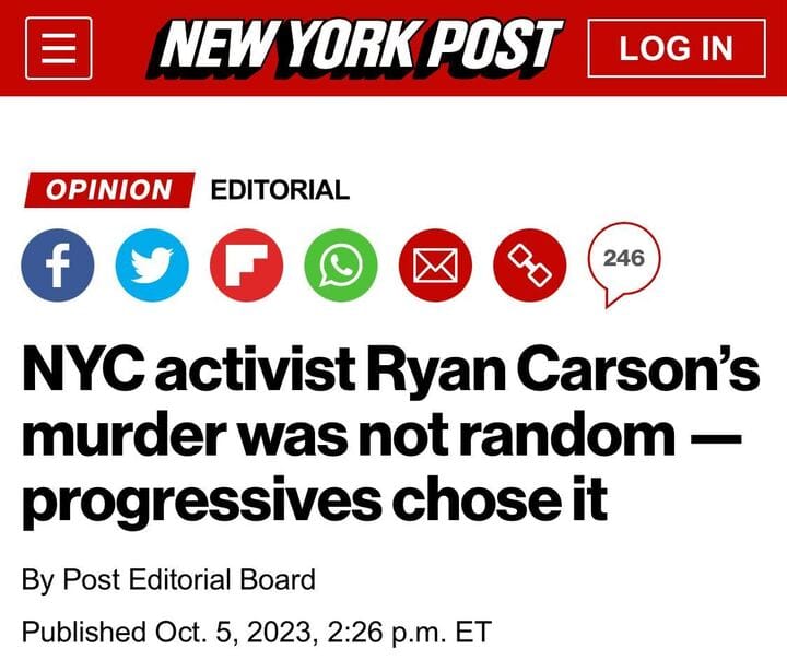 You’ll see that this is from the editorial board. This is the official position of the paper as a whole. And it’s not exactly a new take from The Post. Every time any crime has happened to progressive New Yorkers, they’re quick the bring up that the victim opposes endless police funding, as though that means they deserve to be robbed or attacked. But this might be the first time that they’ve responded to the random murder of a person with left-leaning views by saying progressives caused it, with the attendant implication that Ryan deserved it. It’s not just Andy Ngo, Matt Walsh, and Nick Fuentes, this is the mainstream conservative view now, which goes hand in hand with the rise and entrenchment of fascism on the right. "Our opponents deserve violent murders" is a position that must be called out and cannot become normal in any way, shape, or form.