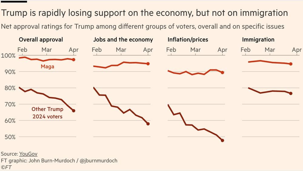 Even more important than elites going at it over tariffs, the working class portion of the Trump coalition is beginning to fracture around the economy too. The graphic below, from John Burn-Murdoch and YouGov, uses data collected before this new stock market chaos. But as you can see the threat of tariffs, the persistent high prices, and the economic uncertainty were already starting to break apart the Trump coalition when it comes to support for the president’s economic agenda: