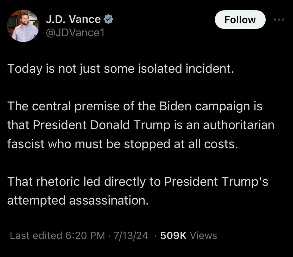 But for Congressman Collins, the fact of Trump’s propensity for advocating violence doesn’t matter. For fascists, the truth is entirely subjugated by power. And Collins wasn’t alone. Lauren Bobert went on TV not long after the shooting to say, “Joe Biden is responsible for the shooting.” Donald Trump Jr. issued a statement about his father which included the line, “He will never stop fighting to save America, no matter what the radical left throws at him.” And JD Vance, GOP Senator from Ohio, possible Trump VP pick, and manipulative fascist, tweeted the following: