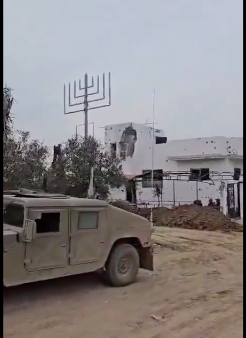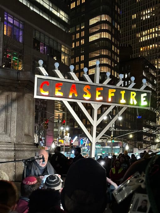 The image on the left (or on top depending on where you’re reading this) is from Blake Pruitt of IfNotNow NYC. It is from the first night of Hanukah this year, where a huge crowd of Jewish New Yorkers got together to usher in the first night of this holiday the only way that felt possible this year, which is to call for a ceasefire and promote a lasting peace. Opposite it, in so many ways, is an image from Israeli forces in Gaza. They brought a menorah into the Shejaiya neighborhood of Gaza after its occupation and the ethnic cleansing of its residents. This image hurts me, profoundly. It is the opposite of the tradition I grew up in, a twisted use of one of our iconic symbols, and an indication of the dangerous path that our religion, and really any religion, can be taken down when warped by fascism and colonialism and the abandonment of core principles. These images begin to tell us an alarming and tragically needed story. And in the middle of this Chanukah I’d like to tell you some of the rest.