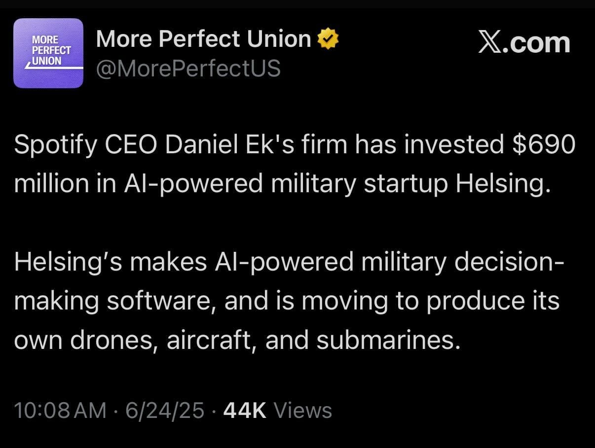 The primary product of Helsing is military drones that use AI. It sounds like a product out of a dystopian sci-fi novel. These drones will be used to kill and hurt people, and a man with $10 billion in wealth built off hurting the music industry and depreciating the monetary value of artists’ music feels the need to invest in this heinous startup. This is the sick way of thinking, investing, and moving through the world that pervades the ruling class more than ever. We live in an era dominated by naked greed, dominated by a ruling class that never believes they have enough even as inequality reaches record highs not seen in the gilded age or the lead up to the French Revolution.