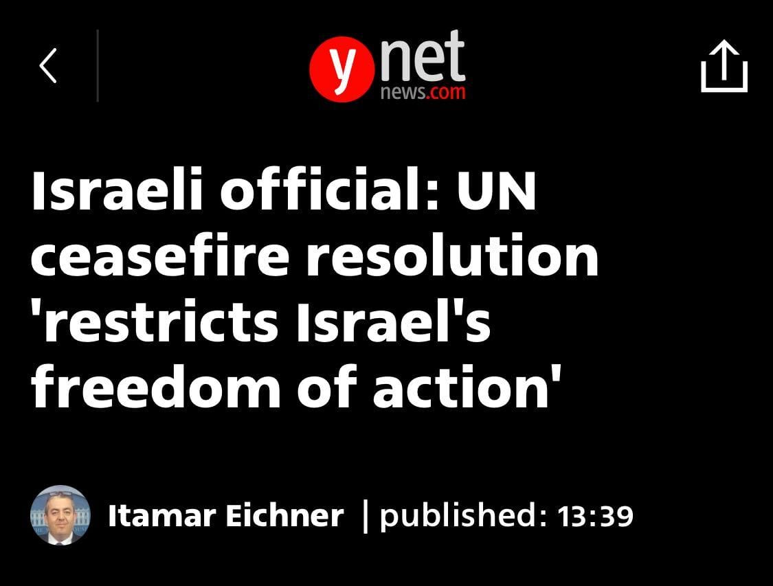 This story is developing, and today things could change, but at the moment Netanyahu is rejecting peace, again. After the UN Security Council Resolution passed, one of Israel’s representatives to the United Nations stated, “Israel stands firm on our principles, and they have not changed. We will continue until all of the hostages are returned and until Hamas military and governing capabilities are dismantled.” At almost the same time a senior Israeli official told Israeli outlet Ynet that the resolution passed by the UN Security Council, "restricts Israel's freedom of action." According to him, "The U.S. accepted a very problematic formulation” when it finalized the ceasefire resolution. This US-drafted resolution also happens to explicitly state in Article 1 that it's a proposal "which Israel accepted," something that appears to be blatantly untrue.