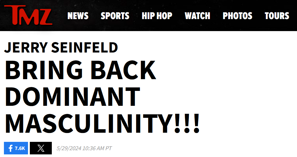 I never thought I’d be writing about Jerry Seinfeld, but here we are. Jerry’s latest completes his arc from well liked comedian who managed to be funny while talking about nothing to washed-up guy who will now spend as much time as possible talking about how he’s canceled – on a range of TV shows and podcasts. His most recent comments show exactly where he is, and where he’s headed. On the podcast of conservative darling and pho-journalist Bari Weiss Seinfeld made some comments about men these days, essentially calling for the return of old-school patriarchy. Jerry eloquently said, “Yeah, I get the toxic thing. Thank you, thank you. But still, I like a real man." He also explained that he misses the unspoken hierarchy in society from back in the good old days.